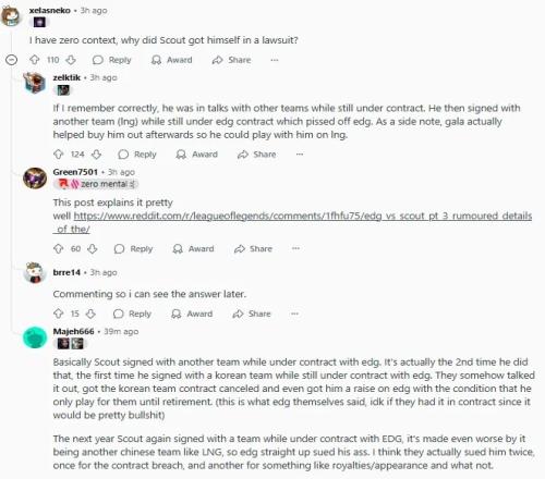 简单来说,Scout在EDG合同期内又签了其他战队。这已经是他第二次这么干了,第一次是和韩国战队签约,当时EDG居然还跟他和解了,不仅让韩国战队合同作废,甚至给他涨了工资,条件是他必须为EDG效力到退役(这是EDG自己说的,不确定合同里是否真这么写了,要真有也太扯了)。